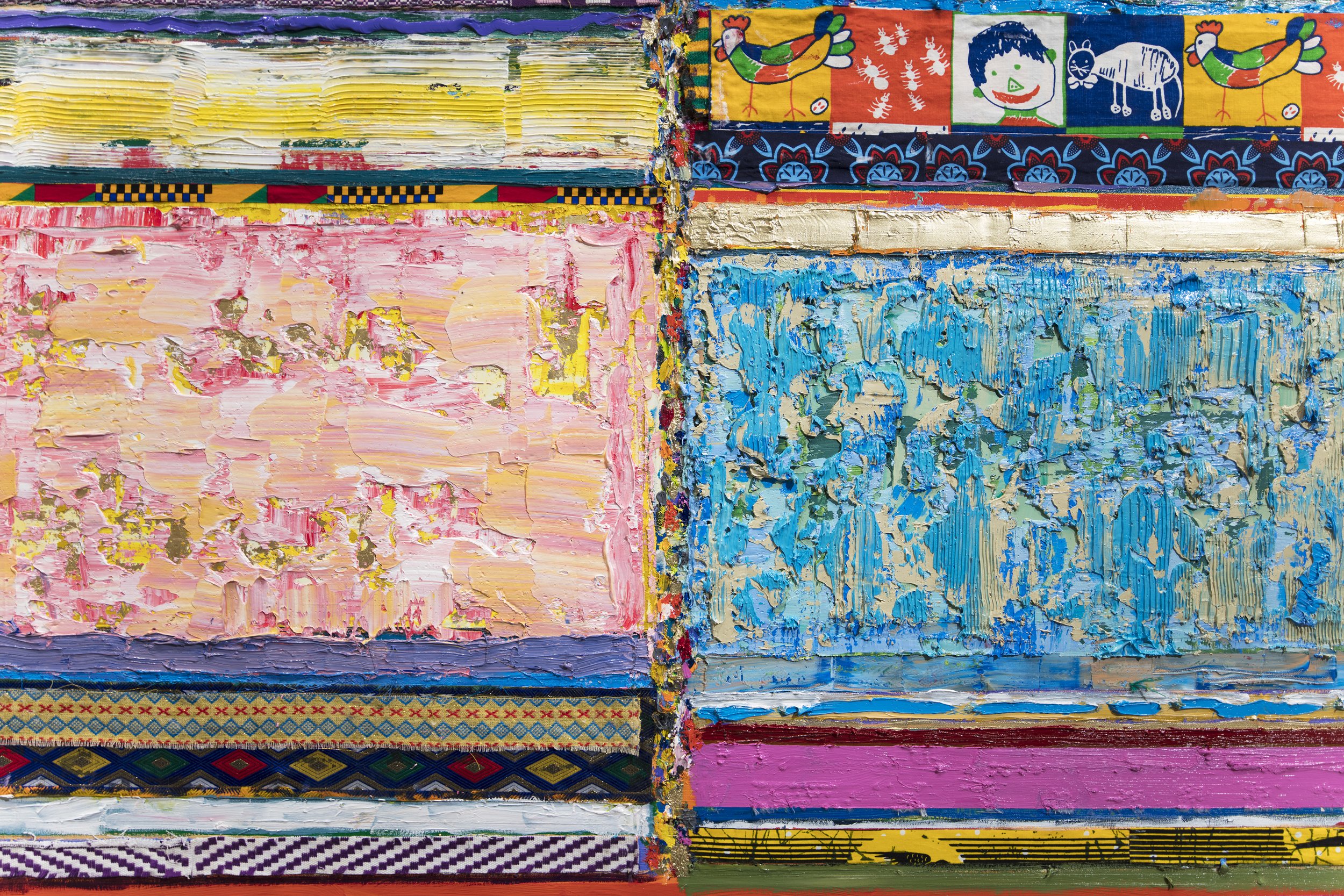 Tegene’s paintings are structured through a persistent yet dynamic geometric framework, within which dense fields of color are built up through repeated layering. His process involves the accumulation of oil paint, pastel, and textiles, applied with palette knives, brushes, and the artist’s hands. Each gesture deposits material weight, creating surfaces that bear the traces of time, formed through materials produced across differing temporalities, through collective and individual labor, and through the persistence of touch.